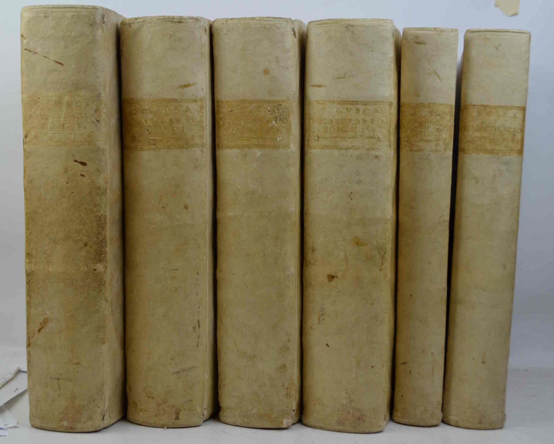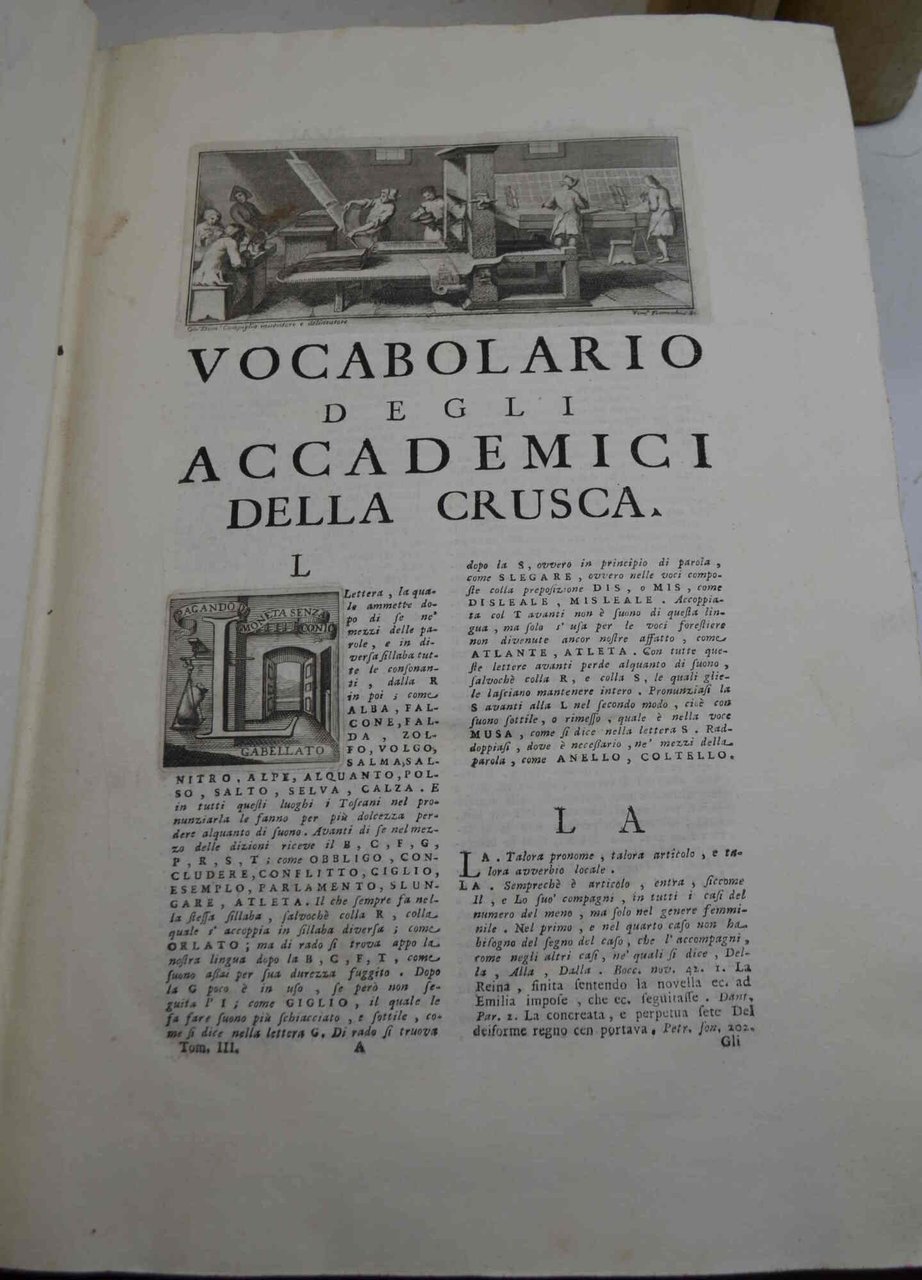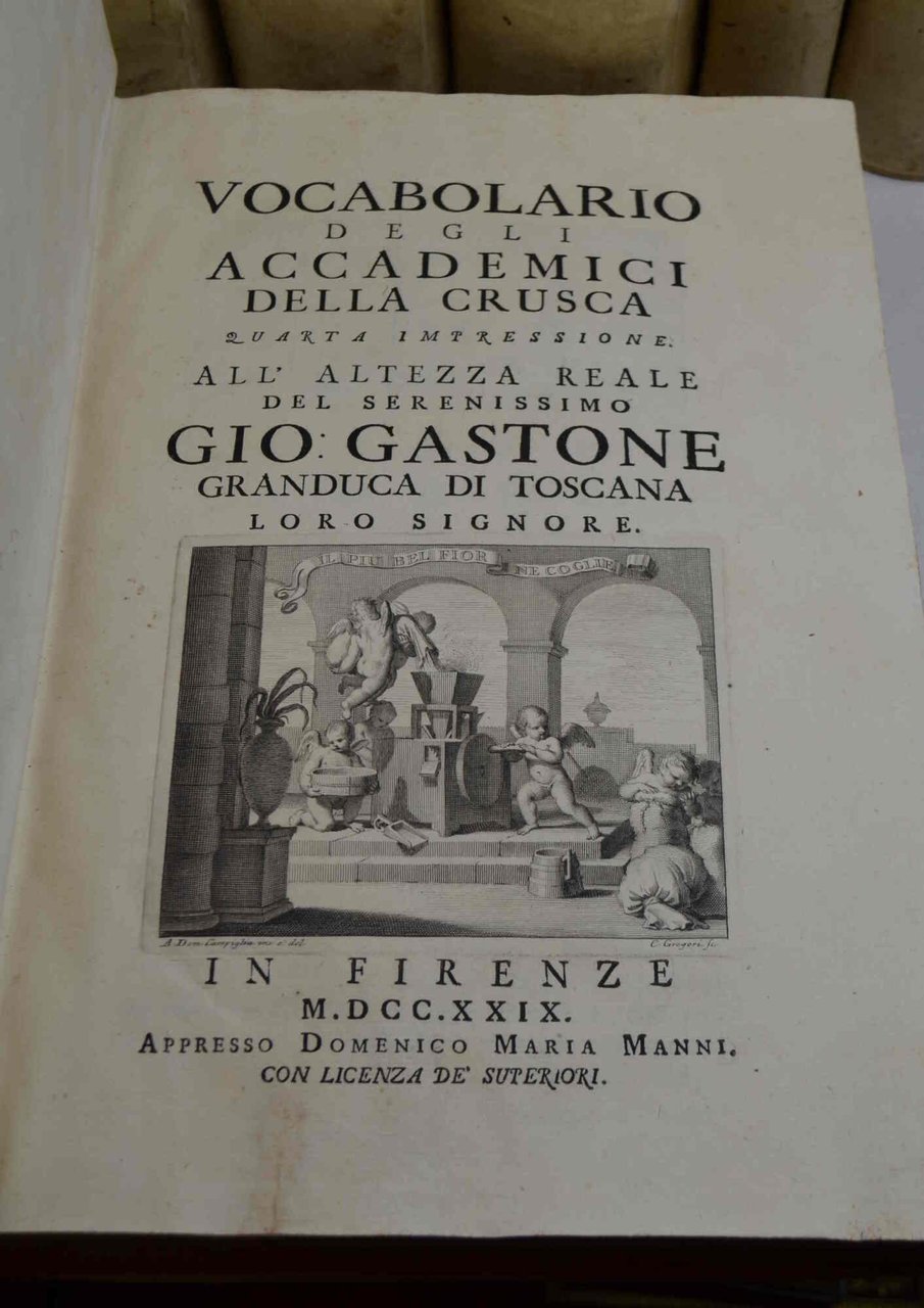 Sei volumi in-folio (cm. 39), pp. 4000 ca. complessive. Bell'antiporta al primo volume, ciascun frontespizio con grande incisione centrale (frullone della Crusca) incisioni nel testo in luogo di testate, finali ed innumerevoli, elegantissimi capolettera figurati. Legatura strettamente coeva in piena peragmena rigida, dorsi lisci con titoli in oro. Solo qualche mancanza di pergamena ai bordi di 2/3 volumi, peraltro esemplare genuino e ben conservato. Magnifica edizione, cfr. Gamba 2812: "Quarta edizione, più copiosa, più riputata, e l'unica oggidì adottata per testo di lingua...".
