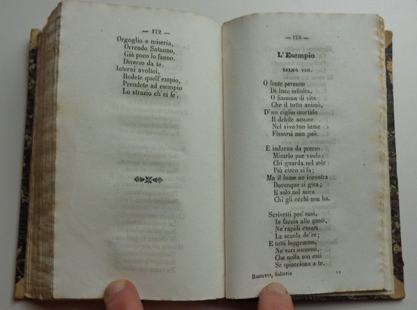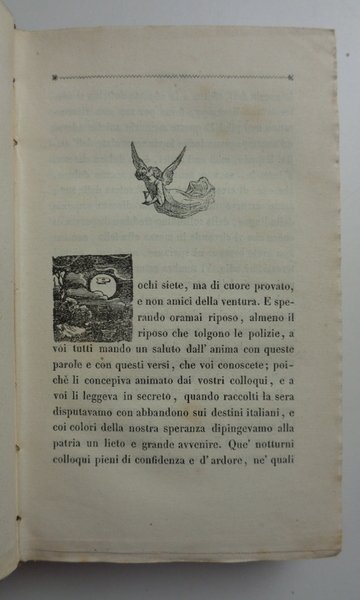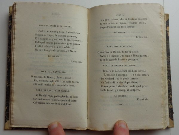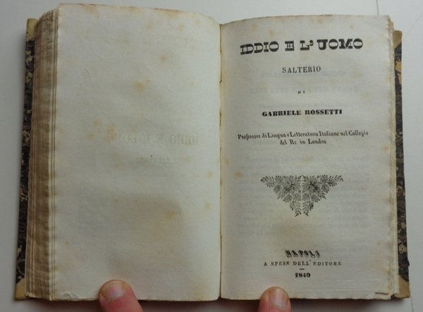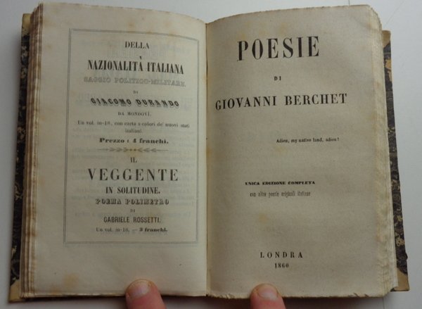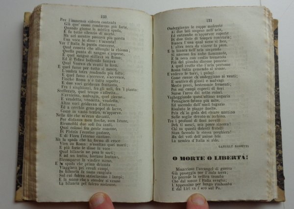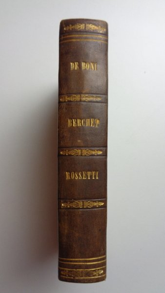 Tre opere riunite in un volume (10x15 cm) in mezza pelle di metà Ottocento, dorso liscio ornato e dorato con nome dei tre autori. 1 De Boni: 135-(8) pagine. 2 Berchet: 144 pagine. 3 Rossetti: 217-(3) pagine. Qualche fioritura al taglio, ma per il resto bel volume in graziosa legatura coeva. La composizione del volume indica chiaramente il pensiero politico risorgimentale di chi lo ha voluto. Filippo De Boni fu mazziniano, esule in Svizzera, dove è appunto pubblicata questa opera, in prima edizione. Berchet si può considerare come il poeta del Risorgimento. Rossetti, professore di Lingua e Letteratura Italiana nel Collegio del Re in Londra (così è definito nella pagina di titolo) è a sua volta uno dei grandi esuli dell'opposizione politica negli anni del Risorgimento.