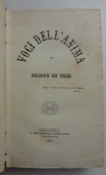 VOCI DELL'ANIMA. Seguito da: POESIE. Unica edizione completa con altre poesie originali italiane. Seguito da: IDDIO E L'UOMO. Salterio. | Libri antichi e moderni | Filippo De Boni, Giovanni Berchet, Gabriele Rossetti