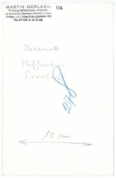 22,7:14,5 cm. Die S/W-Aufnahme (rückseitig gestempelt: "Martin Gerlach | Fotografisches Atelier") eines mit dem erhabenen Stadtwappen Wiens gezierten Keramikkrugs von Hoffmann zur Erhöhung der Schattenwirkung mit Deckweiß gehöht, rückseitig mit Bemaßung versehen und eigenh. beschriftet: "Keramik | Hoffmann | Powolny". - Der Bildhauer u. Keramiker Michael Powolny (1871-1954) arbeitete schon bei der Ausstattung des Cabaret Fledermaus mit dem Begründer der Wiener Werkstätte zusammen und unterrichtete ebenso wie Josef Hoffmann selbst an der Wiener Kunstgewerbeschule.