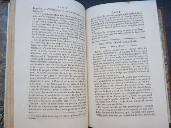 Chez Masson et fils. | Paris 1824 | 13 x 20 cm | relié | [Journeys to the interior of Central America: including those from Buenos Aires to Assumption by way of the Plata river and back, from Buenos Aires to Valparaiso by way of the Mendoza plain and the town of Santiago de Chile, into the valleys and peaks of the Cordillera over a distance of almost 450 leagues, containing some of the richest mines in Chile, the return from Valparaiso and Santiago, the navigation of the Coquimbo to Lima, the capital of all Central America, the tortuous route from Lima to Guayaquil, and around Quito province, including to an ancient Inca city. Also including the voyage from the aforementioned capital to Santa Fe de Bogota by way of Cuença, Calil, and Popayan, an extraordinary and interesting region in terms of its trade, a description of the environs of Santa Fe, the centre of the Colombian Republic, as well as of the nature and liveliness of its trade, likewise for all the territory on the way to the port of Cartagena, where the author embarked for Cuba and Jamaica, whose most remarkable features he also records. With detailed accounts of the mores, customs and character of the inhabitants, local products and the riches of the vast expanse of this new continent, the best way of travelling there, the best places to stop and pause, the merchandise to take for exchange, as well as worthwhile precautions against being cheated by the inhabitants and against the innumerable reptiles to be found there; a useful work for sailors and for any commercial traveler] Marked the second edition, the first apparently being that of 1823 published in Agen, with a slightly different title. Rare. This second edition appears to be even scarcer than the first. Held only in the Bibliothèque Sainte Geneviève in Paris. The French Bibliothèque Nationale and the British Library, as well as UK libraries hold no copies. The Bibliothèque Nationale and the British Library each have only one copy of the first edition. Contemporary light brown sheep. Spine with 2 compartments with grotesques, 2 fleurons and roulettes. Red morocco title-piece. A one centimeter-long split to head and foot. The author spent 12 years in South America. He left in 1808 on the brig Le Consolateur. “Obliged to move endlessly through the various provinces of this vast tract of the New World, I began to study the mores, characters, and habits of its inhabitants. I was particularly keen on learning how to travel in these climates.and lastly the various branches of commerce undertaken there.” * [FRENCH VERSION FOLLOWS] | Voyages dans l'intérieur de l'Amérique Méridionale : contenant la relation de celui fait de Buenos-Aires à l'Assomption par la rivière de la Plata, et retour, de Buenos-Aires à Valparaiso par la plaine de Mendoza et la ville de Santiago du Chili, de cette dernière ville dans les vallées et les sommités des Cordillières, dans une étendue de près de 450 lieues, où sont situées les nombreuses et les plus riches mines du Chili, retour à Valparaiso et Santiago, navigation de Coquimbo à Lima, capitale de toute l'Amérique méridionale, route pénible de Lima pour se rendre à Guayaquil, et dans la province de Quito, ancienne ville des Incas, de cette capitale à Santa-Fé de Bogota par Cuença, Calil, Popayan, pays for curieux et trés intéressant à parcourir pour les affaires, description des environs fertiles de Santa-Fé, centre de la république de la Colombie, de la nature et de l'activité de son commerce, comme de toutes les contrées que l'on traverse en s'acheminant vers le port de Carthagène où l'auteur s'embarqua pour Cuba et la Jamaïque, dont il fait aussi connaître les choses les plus remarquables Accompagnés de renseignemens précis sur les moeurs, coutumes et caractères des habitans, sur les produits et les richesses qu'offre l'immensité de ce nouveau continent, la meilleure manière d'y voyager, les stations et les posades à s'y ménager, les marchandises d'échange à y porter, les préc