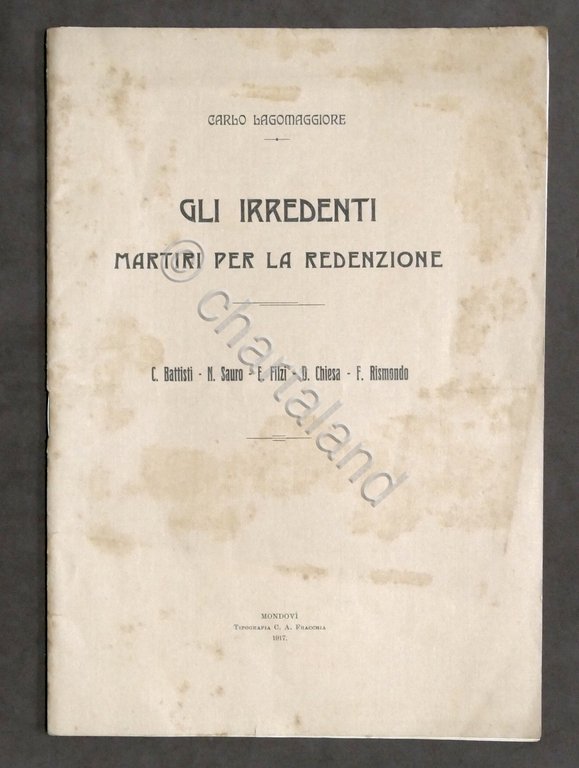 Carlo Lagomaggiore - Gli irredenti - Martiri per la redenzione - C. Battisti, N. Sauro, F. Filzi, D. Chiesa, F. Rismondo - 1^ ed. 1917 Pag. 24 Copertina morbida - Testo in italiano. Condizioni molto buone. Copertina come da foto.