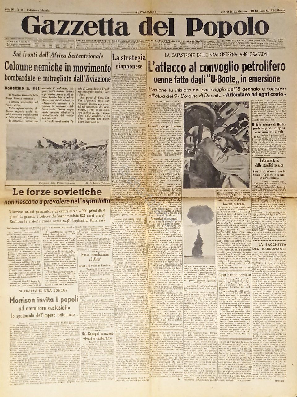 WWII - Gazzetta del Popolo N. 10 - 1943 La catastrofe delle navi-cisterna Testo in lingua italiana. Pagine 4 Condizioni buone con segni del tempo come da foto.