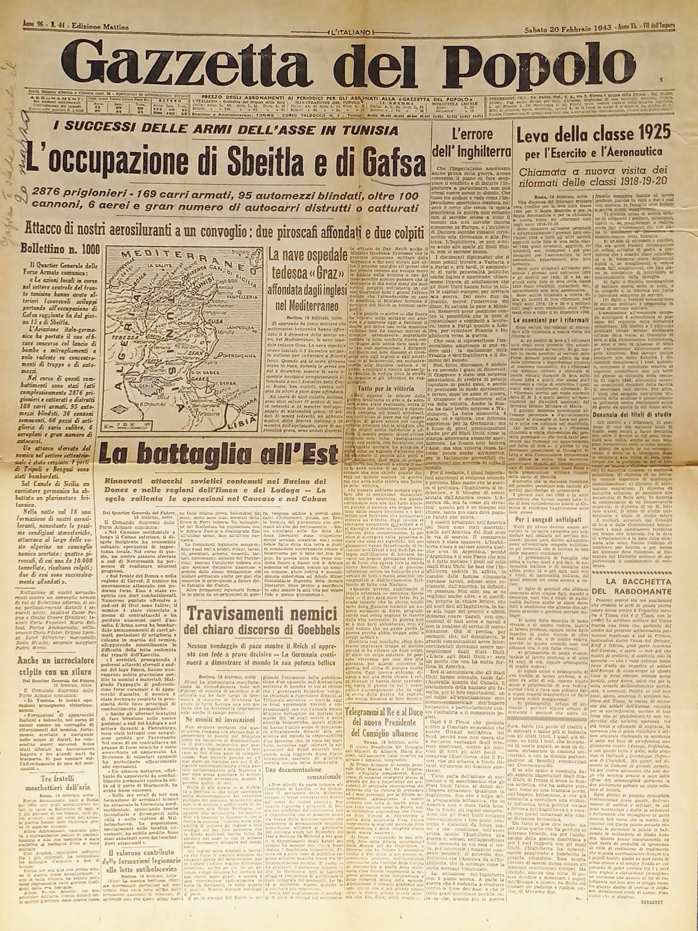 WWII - Gazzetta del Popolo N. 44 - 1943 L'occupazione di Sbeitla e di Gafsa Testo in lingua italiana. Pagine 4 Condizioni buone con segni del tempo come da foto.