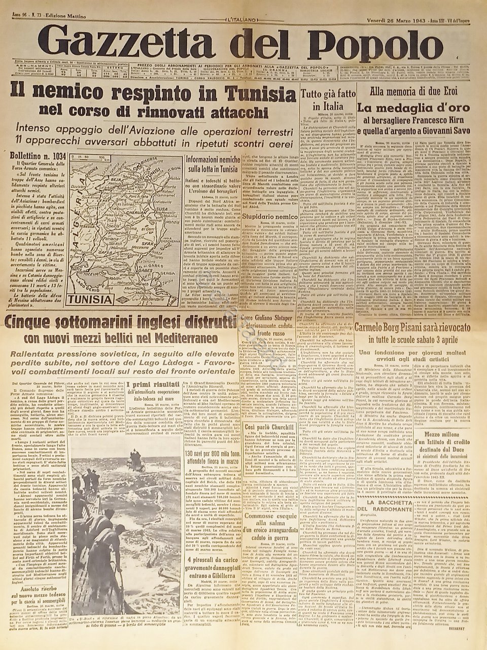 WWII - Gazzetta del Popolo N. 73 - 1943 Il nemico respinto in Tunisia Testo in lingua italiana. Pagine 4 Condizioni buone con segni del tempo come da foto.