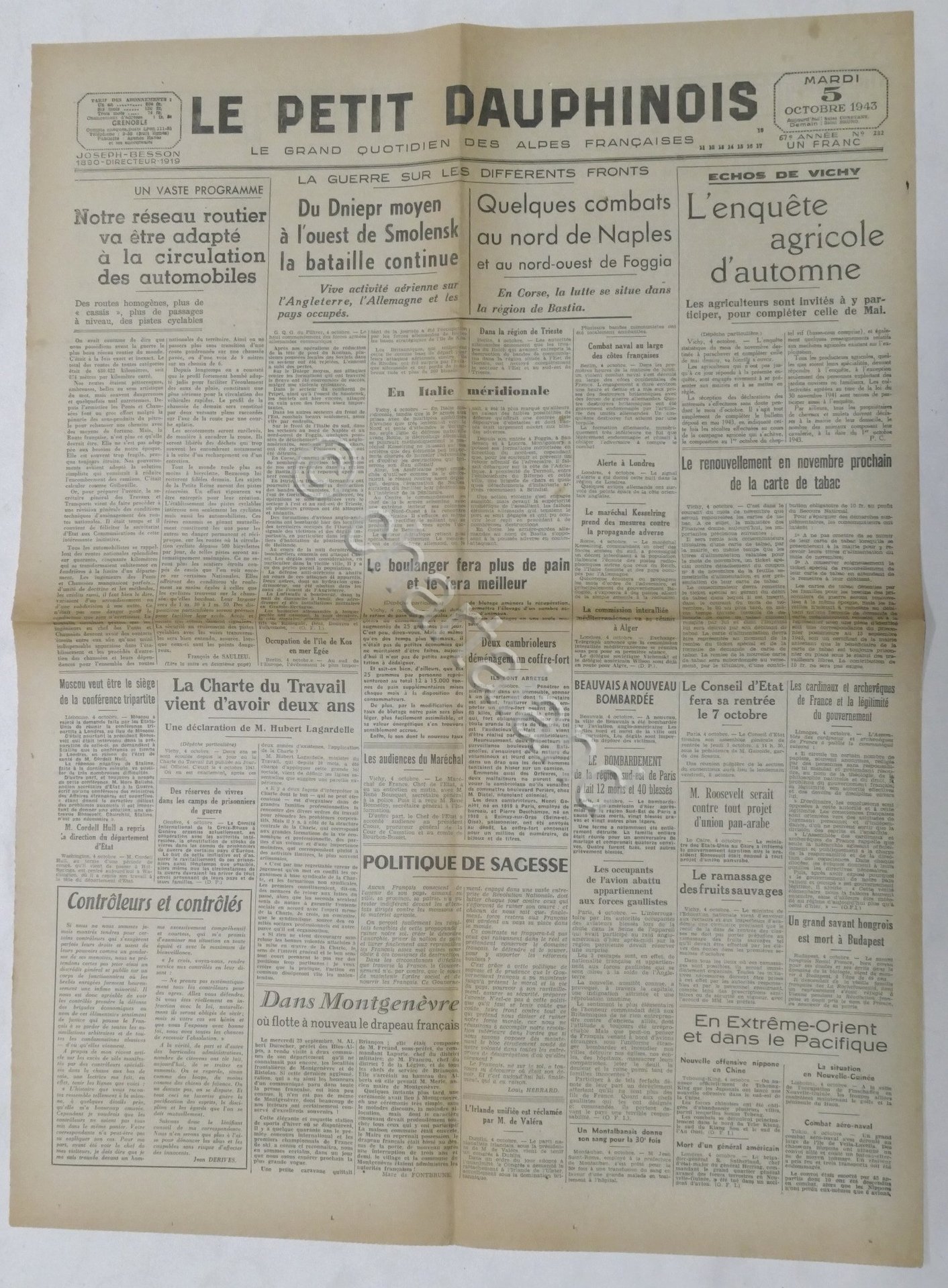 WWII Giornale - Le Petit Dauphinois N. 232 - 1943 Quotidien des Alpes Francaises