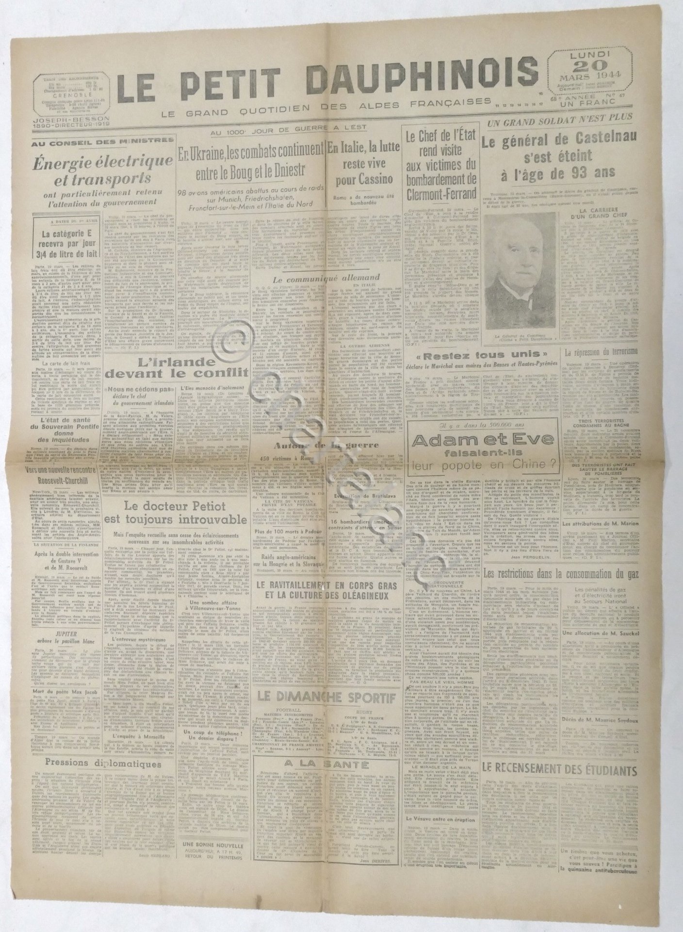 WWII Giornale - Le Petit Dauphinois N. 67 - 1944 Quotidien des Alpes Francaises