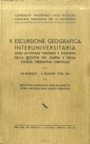 X escursione geografica interuniversitaria sugli altopiani veronesi e vicentini, nella regione del Garda e nella Venezia Tridentina orientale: 26 maggio-2 giugno 1935: brevi note illustrative.