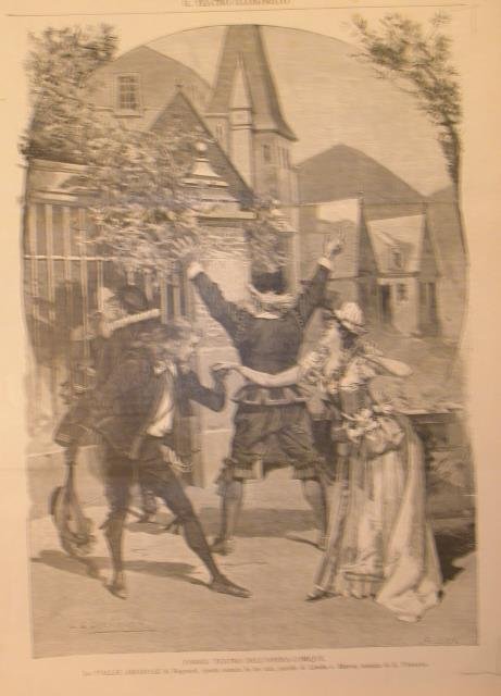 Xilografia raffigurante una scena di "Le follie amorose" ("Les folies amoreuses", 1891), opera comica in tre atti di Regnard, parole di Lénéka e Matrat, musica di Emile Pessard, eseguita a Parigi al Teatro dell'Opéra Comique. | Libri antichi e moderni |
