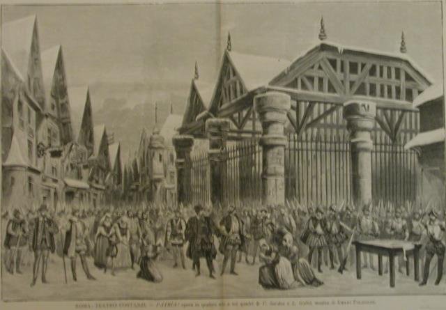 Xilografia raffigurante una scena di "Patria!", opera in quattro atti e sei quadri di Victorien Sardou e L.Gallet, rappresentata al Teatro Costanzi di Roma con la musica di Emilio Paladilhe (Montpellier, 1844-1926). | Libri antichi e moderni |