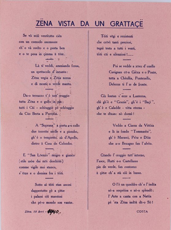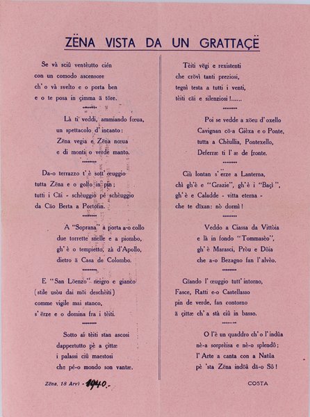 (Codice TI/0336) Poesia in dialetto genovese, 12 strofe. Foglio volante, carta rosa, piegato in 4, dedica autografa al verso. Buono stato. ~~~ SPEDIZIONE IN ITALIA SEMPRE TRACCIATA
