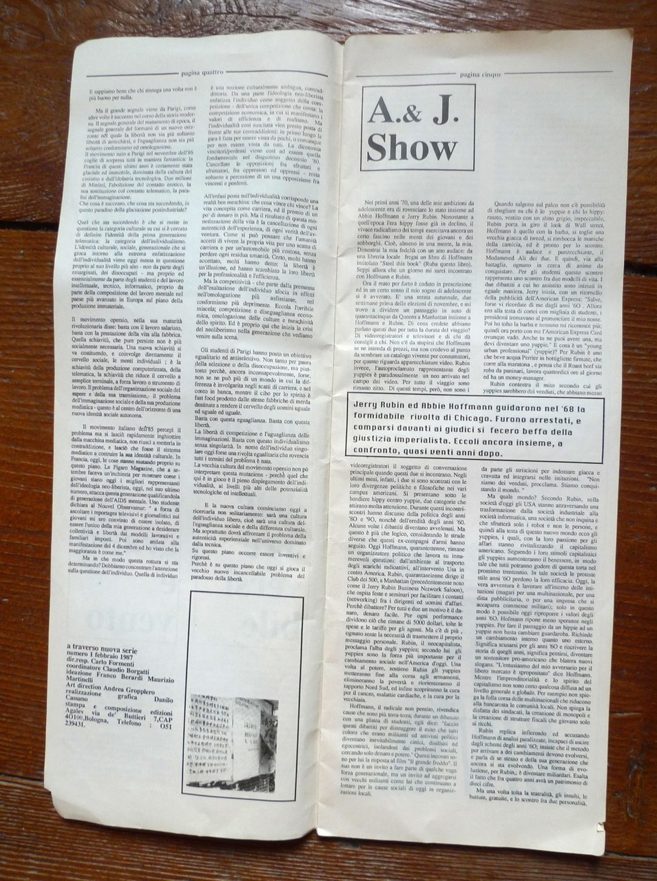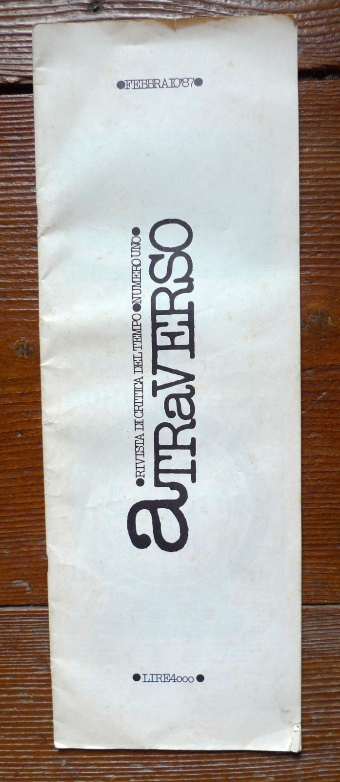 aTRAVERSO NUOVA SERIE Numero 1 Febbraio '87RIVISTA DI CRITICA DEL TEMPO.Direttore responsabile: Carlo Formenti.Coordinatore: Claudio Borgatti.Ideazione: Franco Berardi, Maurizio Martinelli.Stampa e composizione: Editrice Agalev, Bologna 1987,brossura, 45x16 cm., pp.35,illustrazioni in bianco e nero,peso: g.300cod.10205CONDIZIONI DELLA RIVISTA: buone,copertina leggermente ingiallita,macchie alla IV di copertina,strappetto alla copertina,piccola mancanza ad un angolo della copertinae della prima pagina,interno ottimo