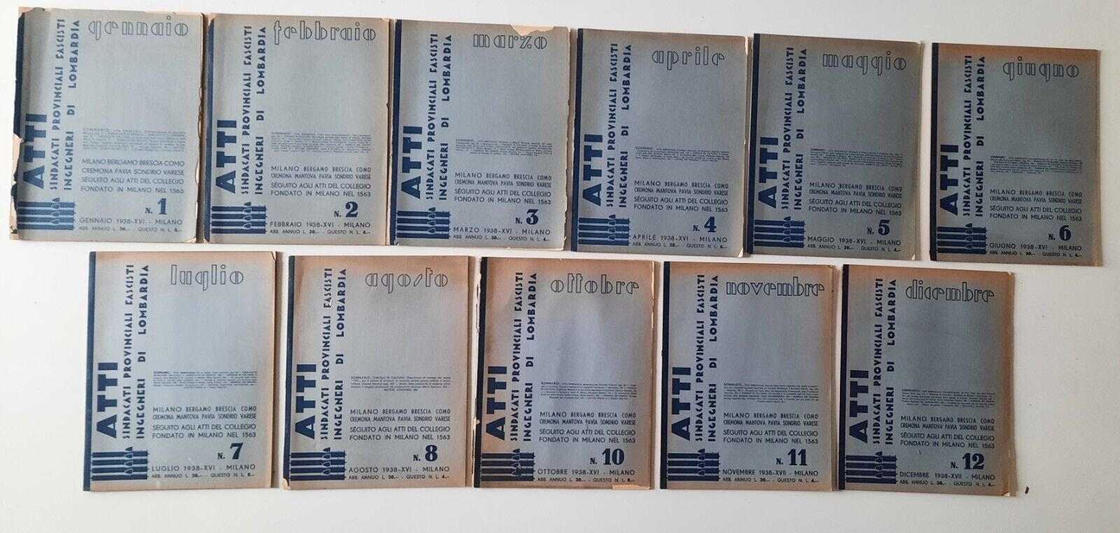ATTI SINDACATI PROVINCIALI FASCISTI INGEGNERI LOMBARDIA ANNATA 1938 11 NUMERIIn 4° grande, legatura editoriale, copertina illustrata.Lievi segni alla copertina, piccole mancanze e strappi.