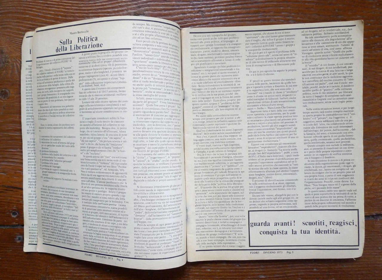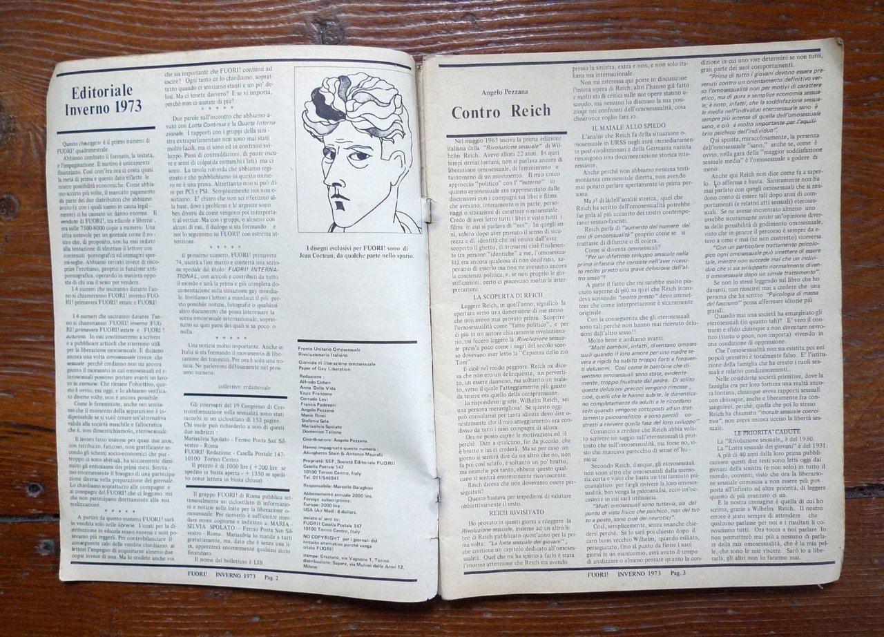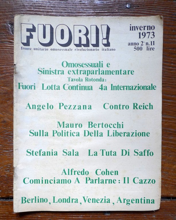 FUORI! Anno 2° n.11 Inverno 1973FRONTE UNITARIO OMOSESSUALE RIVOLUZIONARIO ITALIANO.Giornale di liberazione omosessuale.Paper of Gay Liberation.Coordinatore: Angelo Pezzana.Direttore Responsabile: Marcello Baraghini.S.E.F. Società Editoriale Fuori!, Torino 1973,brossura, rilegatura con punto metallico,30,5x22,5 cm., pp.40,illustrazioni in bianco e nero,peso: g.300cod.10211CONDIZIONI DELLA RIVISTA: buone,copertina e pagine ingiallite,piega ad un angolo dell'ultima di copertina,strappetto in corrispondenza del punto metallico