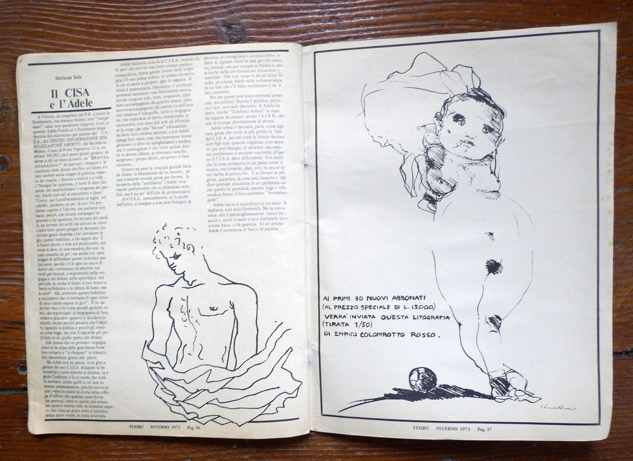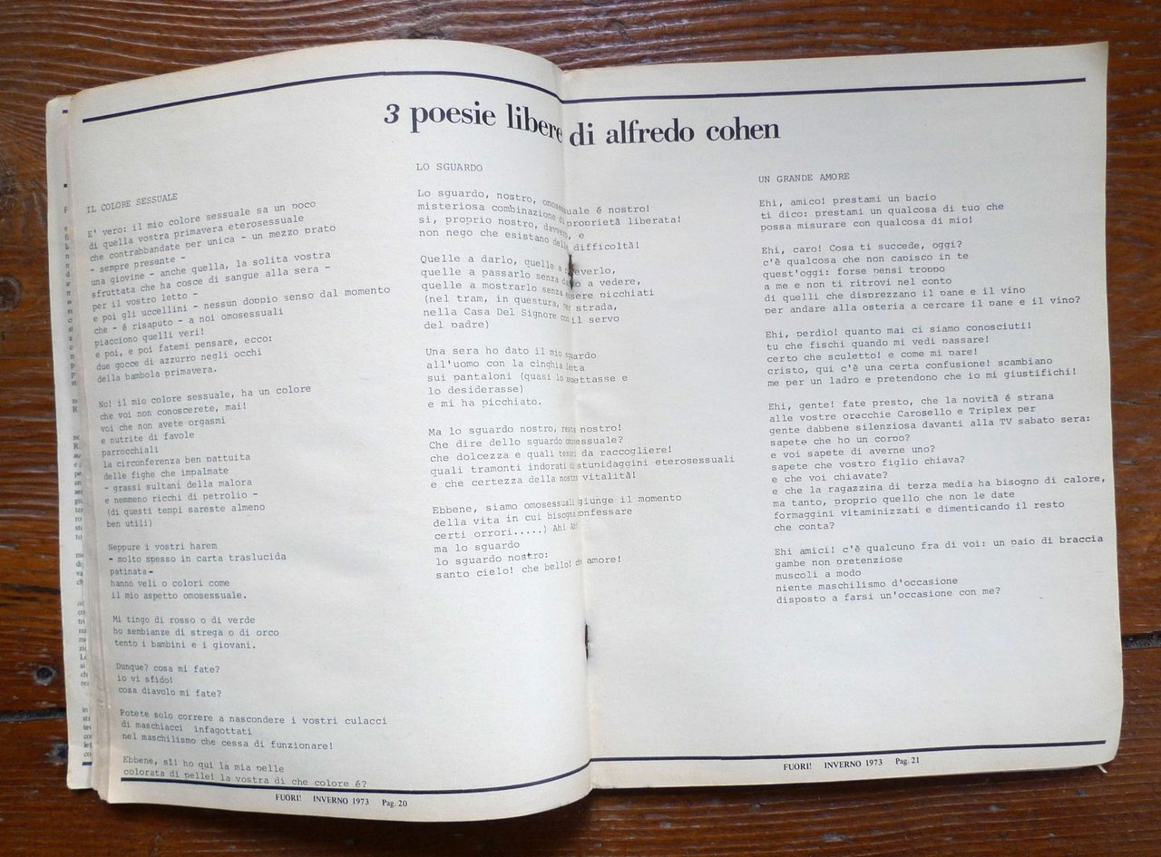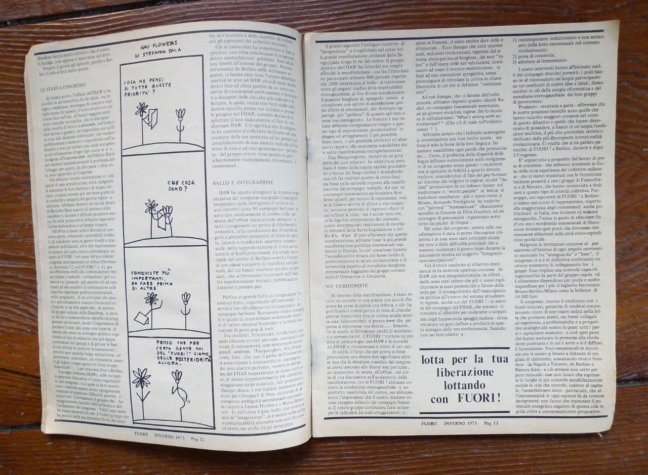 FUORI! Anno 2° n.11 Inverno 1973FRONTE UNITARIO OMOSESSUALE RIVOLUZIONARIO ITALIANO.Giornale di liberazione omosessuale.Paper of Gay Liberation.Coordinatore: Angelo Pezzana.Direttore Responsabile: Marcello Baraghini.S.E.F. Società Editoriale Fuori!, Torino 1973,brossura, rilegatura con punto metallico,30,5x22,5 cm., pp.40,illustrazioni in bianco e nero,peso: g.300cod.10211CONDIZIONI DELLA RIVISTA: buone,copertina e pagine ingiallite,piega ad un angolo dell'ultima di copertina,strappetto in corrispondenza del punto metallico