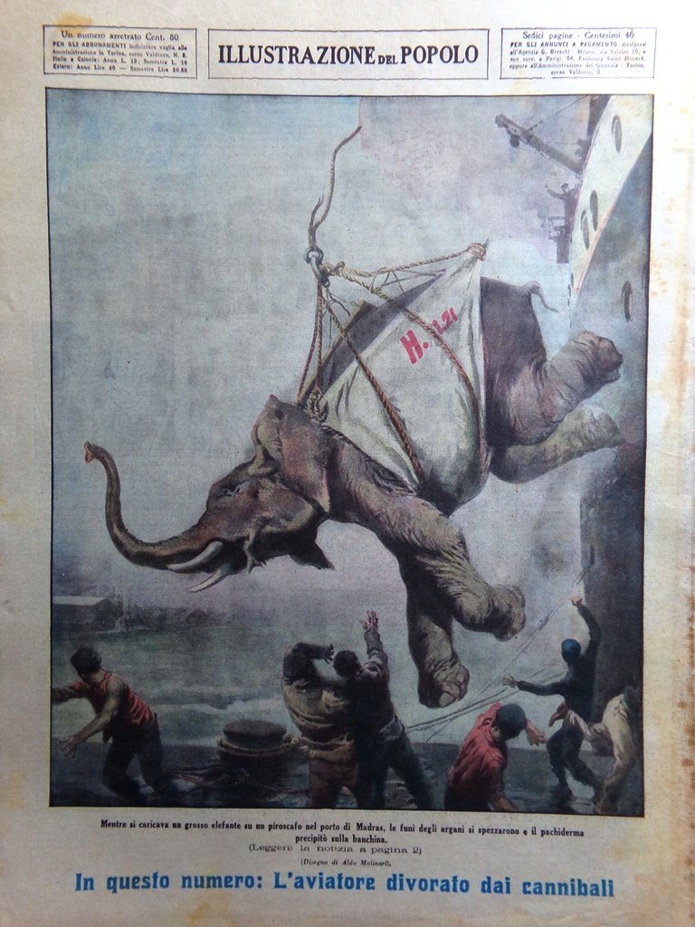 Mentre si caricava un grosso elefante su un piroscafo nel porto di Madras, le funi degli argani si spezzarono e il pachiderma precipitò sulla banchina (Aldo Molinari)