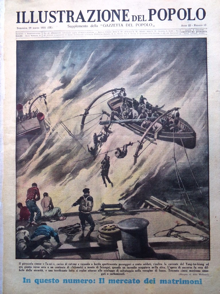 Il piroscafo cinese "Ta-sci", carico di cotone e recando a bordo quattrocento passeggeri e cento soldati, risaliva la corrente del Yang-tse-kiang ed era giunto verso sero a un centinaio di chilometri a monte di Shangai, quando un incendio scoppiava nella stiva. l'opera di soccorso fu resa difficile dalla oscurità e una terrificante lotta si svolse attorno alle scialuppe di salvataggio nella voragine di fuoco. Trecento cinesi morirono annegati o carbonizzati (Aldo Molinari)