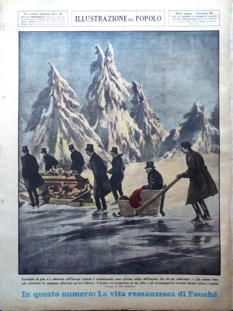 Un'ondata di gelo si è abbattuta sull'Europa centrale e settentrionale come estremo saluto dell'inverno che sta per andarsene. Un curioso funerale attraverso la campagna ghiacciata presso Lubecca: il feretro era trasportato su una slitta e gli accompagnatori avevano dovuto calzare i battini (Aldo Molinari)