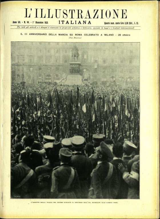 In-4, brossura, mancante delle pagine pubblicitarie ma in buono stato. In questo numero:Il III anniversario della marcia su Roma celebrato a Milano - 28 ottobre.