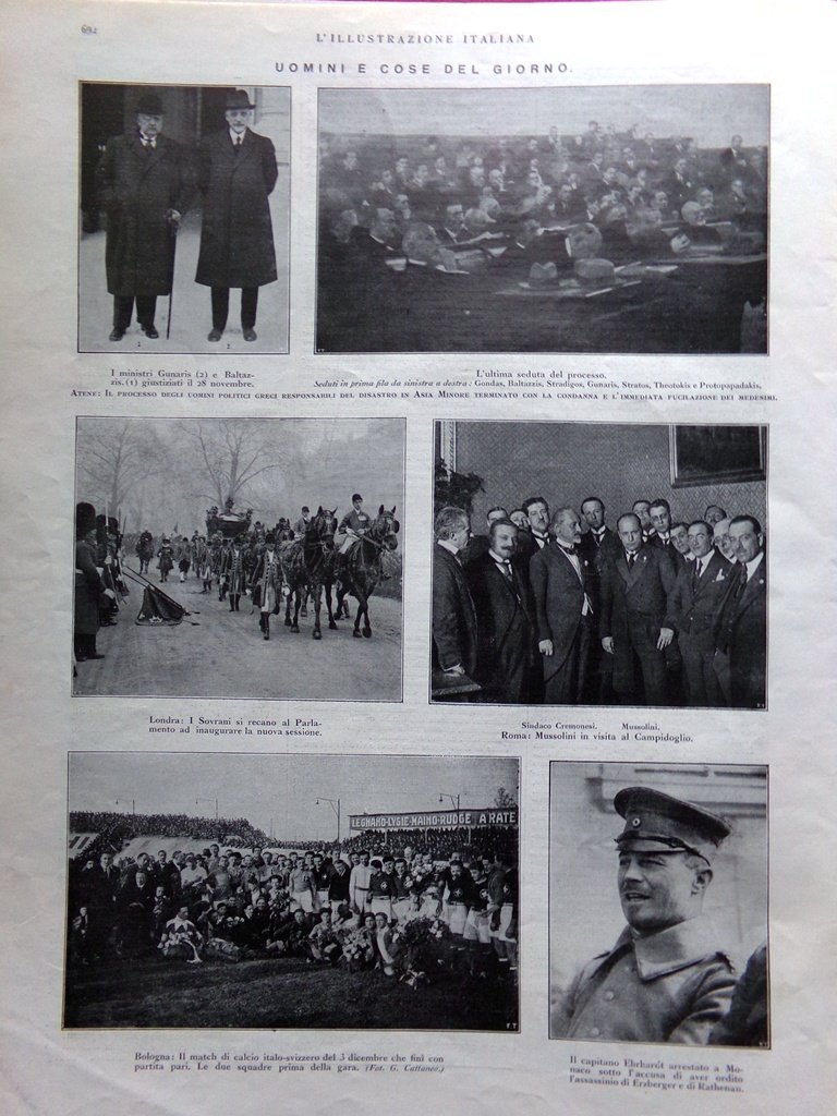 Uomini e cose del giorno: il match di calcio italo-svizzero, Mussolini in visita alcampidoglio, Atene: il processo degli uomini politici greci responsabili del disastro in Asia Minore.