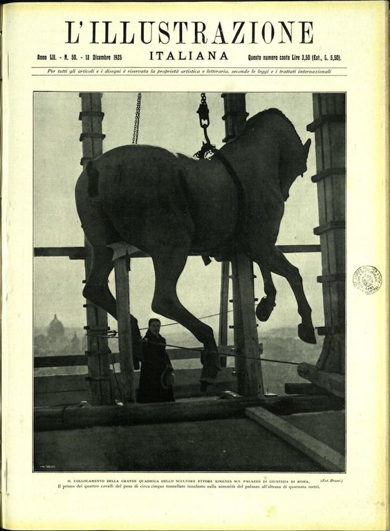 In-4, brossura, mancante delle pagine pubblicitarie ma in buono stato. In questo numero:Il collocamento della grande quadriga dello scultore Ettore Ximenes sul Palazzo di Giustizia di Roma.
