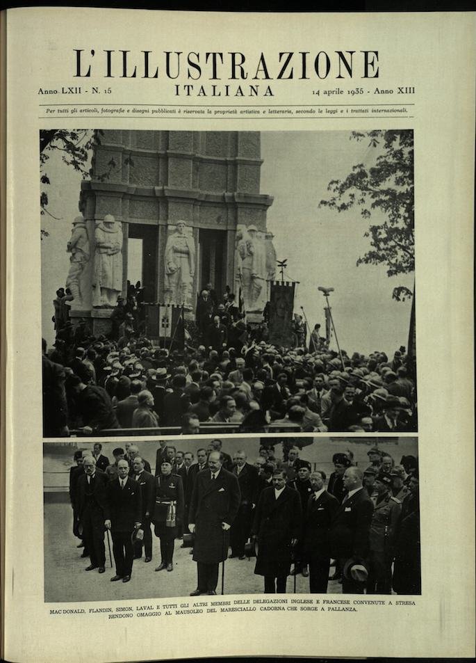 In-4, brossura. In buono stato di conservazione. In questo numero:Mac Donald, Flandin, Simon, Laval e tutti gli altri membri delle delegazioni inglese e francese convenute a Stresa rendono omaggio al mausoleo del Maresciallo Cadorna che sorge a Pallanza.