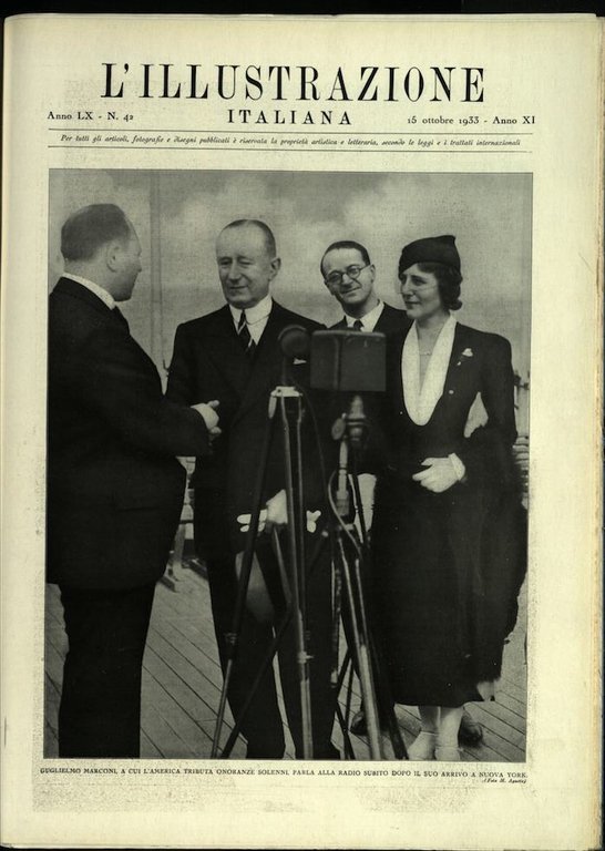 In-4, brossura. In buono stato di conservazione. In questo numero:Guglielmo Marconi, a cui l'America tributa onoranze solenni, parla alla Radio subito dopo il suo arrivo a Nuova York.