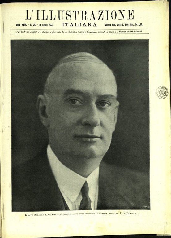 In-4, brossura. In buono stato di conservazione. In questo numero:Il Dott. Marcello T. De Alvear, presidente eletto della Repubblica Argentina, ospite del Re al Quirinale.