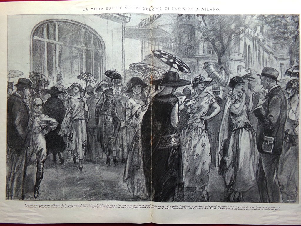 La moda estiva all'ippodromo di San Siro a Milano (stampa in 2 pagine di Bompard)