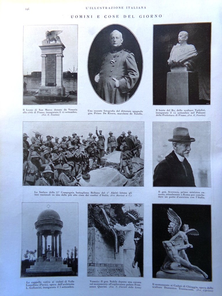 Uomini e cose del giorno: il Leone di San Marco donato da Venezia alla città di Fiume, il monumento ai caduti di Chioggia (Trentacoste), la cappella votiva ai caduti di Valle Lomellina (Gallamini)