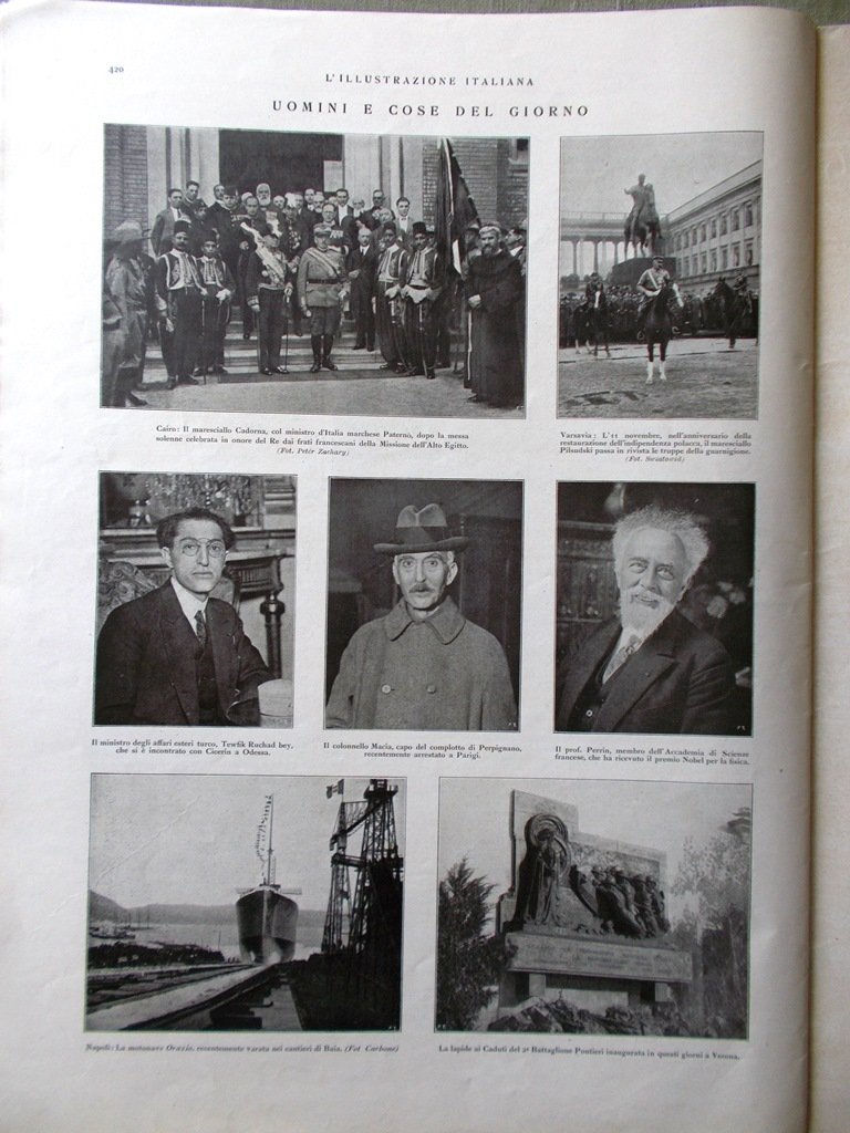 Uomini e cose del giorno: il colonello Macia, capo del complotto di Perpignano recentemente arrestato a Parigi, la motonave Orazio, la lapide ai caduti del battaglione Pontieri a Verona