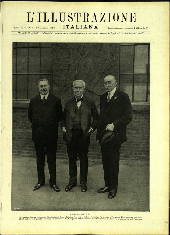 In-4, brossura. In buono stato di conservazione. In questo numero:Tomaso Edison che ha compiuto recentemente gli ottant'anni, fotografato tra l'ingegnere italiano Semenza (a destra) e l'ingegner Lieb, durante una visita al laboratorio del grande inventore, in occasione del Congresso Internazionale d'Elettrotecnica di New York presieduto dal Semenza.