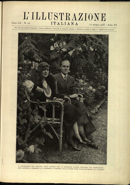 In-4, brossura. In buono stato di conservazione. In questo numero:Il matrimonio del principe delle Asturie con la signorina cubana Edelmira San Pedro-Ocejo: Don Alfonso di Borbone e la consorte a Losanna, ove le nozze sono state celebrate il 21 giugno.