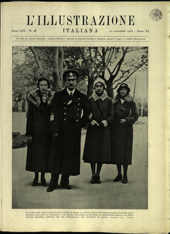 In-4, brossura. In buono stato di conservazione. In questo numero:In attesa del lieto evento alla corte di Sofia: la vista della principessa Maria di Savoia alla sorella Giovanna di Bulgaria - La regina Giovanna, il re Boris, la principessa Maria e la principessa Eudossia, sorella del re, fotografati nel giardino di Varna.
