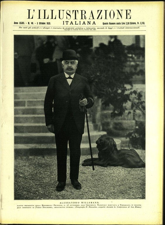 In-4, brossura (dorso cucito). In buono stato di conservazione. In questo numero:Alessandro Millerand, eletto presidente della Repubblica Francese, il 23 settembre, dall'Assemblea Nazionale radunata a Versailles, in seguito alle dimissioni di Paolo Deschanel, gravemente infermo.