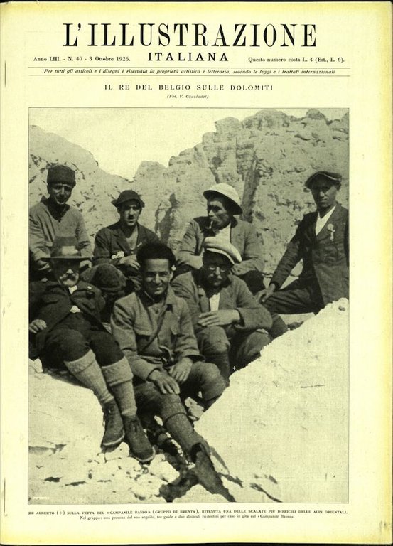 In-4, brossura, mancante delle pagine pubblicitarie, in buono stato. In questo numero:Il Re del Belgio sulle Dolomiti.