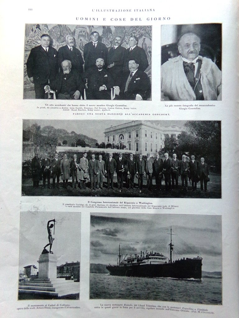Uomini e cose del giorno: la motonave Romolo, il monumento ai caduti di Codogno (Dazzi), Courteline (una nuova elezione all'accademia Concourt)