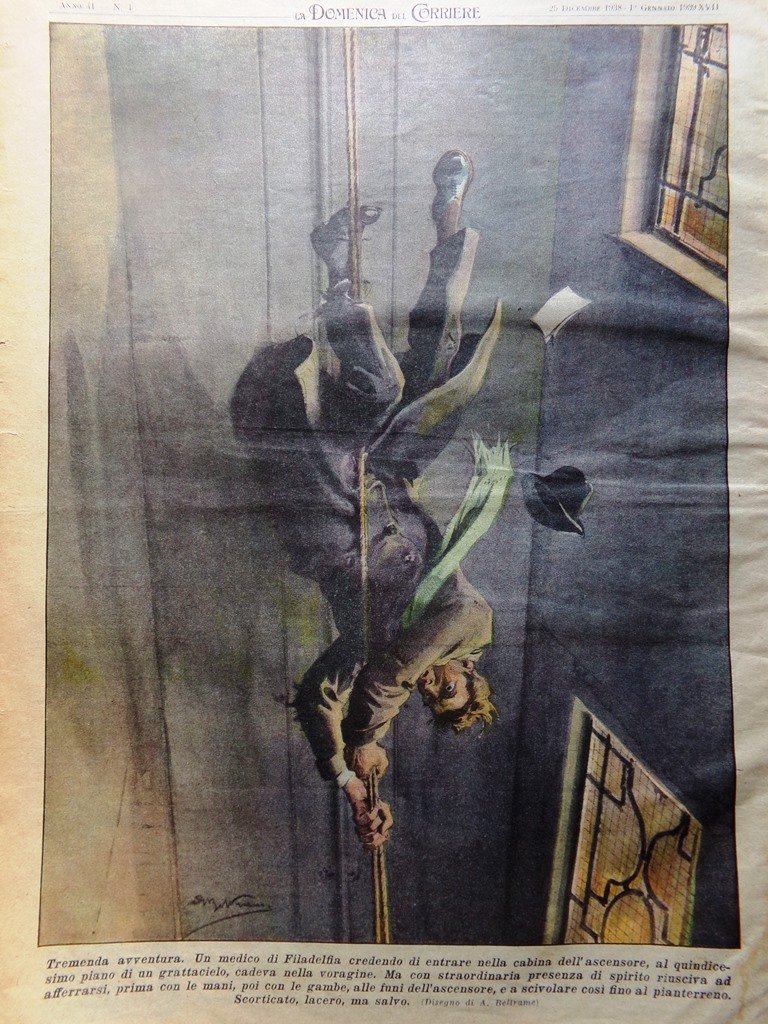 Tremenda avventura. Un medico di Philadelphia credendo di entrare nella cabina dell'ascensore al quindicesimo piano di un grattacielo cadeva nella voragine. Ma con straordinaria prontezza di spirito riusciva ad afferrarsi, prima con le mani, poi con le gambe alle funi dell'ascensore e scivolare così al pianterreno salvandosi la vita (Achille Beltrame)