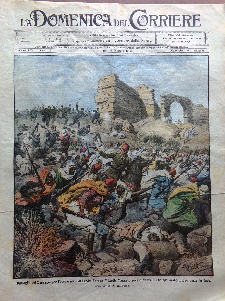 Battaglia del 2 Maggio per l'occupazione di Lebda, l'antica "Leptis Magna" presso: Homs (Achille Beltrame)