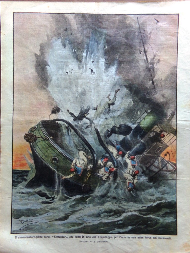Il rimorchiatore-pilota turco "Semendar" che salta in aria con l'equipaggio per l'urto in una mina turca nei Dardanelli (Achille Beltrame)
