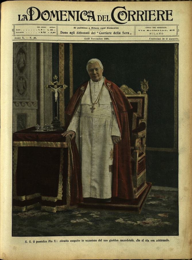 In-4, brossura, in buono stato di conservazione. In questo numero:"S S il pontefice Pio X, ritratto eseguito in occasione del suo giubileo sacerdotale, che si sta ora celebrando.""Ritorno del principe ereditario di Serbia a Belgrado, dimostrazioni entusiastiche del popolo.".