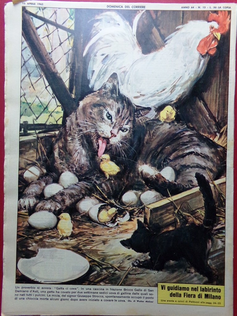 In una cascina in frazione Bricco Gallo di San Damiano d'Asti, una gatta ha covato per due settimane sedici uova di gallina dalle quali sono nati tutti i pulcini. La micia, del signor Giuseppe Strocco, spontaneamente occupò il posto di una chioccia morta alcuni giorni dopo aver iniziato a covare le uova (Walter Molino)
