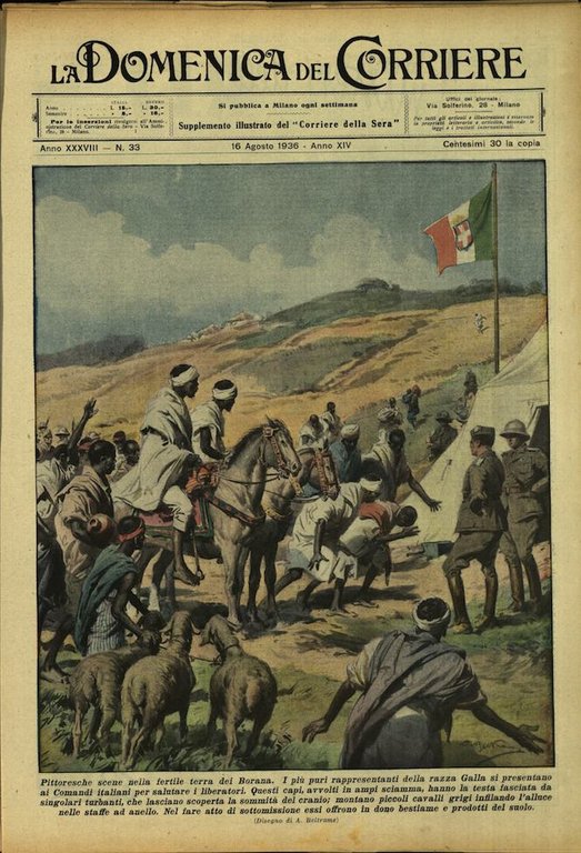 In-4, brossura, in buono stato di conservazione. In questo numero:"Pittoresche scene nella fertile terra dei Borana. I più puri rappresentanti della razza Galla si presentano ai Comandi italiani per salutare i liberatori. Questi capi, avvolti in ampi sciamma, hanno la testa fasciata da singolari turbanti, che lasciano scoperta la sommita del cranio; montano piccoli cavalli grigi infilando l'alluce nelle staffe ad anello. Nel fare atto di sottomissione essi offrono in dono bestiame e prodotti del suolo.""Il cavallo in chiesa. Una processione che aveva percorso le vie di Crespellano (Bologna) stava per rientrare in chiesa, quando un cavallo improvvisamente imbizzarrito scavalcava una siepe e, trascinandosi il calesse a cui era attaccato, entrava nel tempio, tra lo scompiglio dei fedeli.".