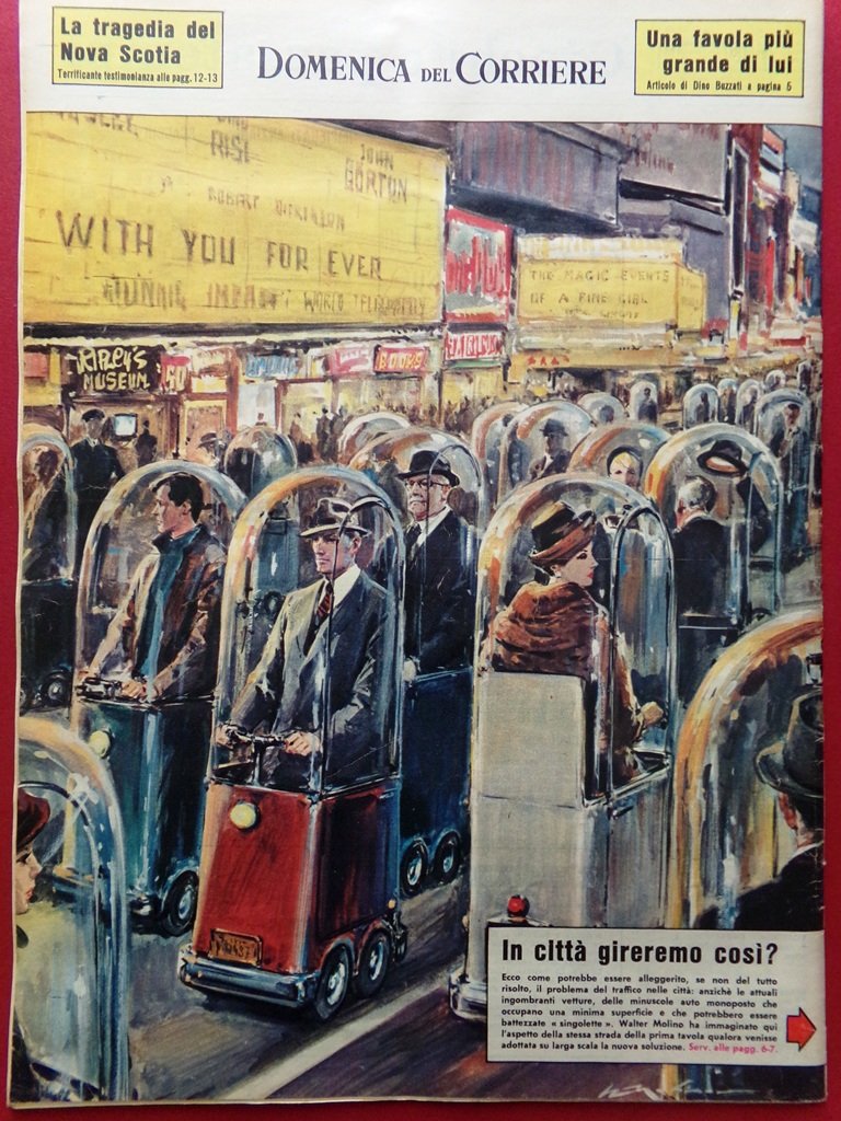 In città gireremo così? Ecco come potrebbe essere alleggerito, se non del tutto risolto, il problema del traffico nelle città : minuscole auto monoposto che occupano una minima superficie (Walter Molino)