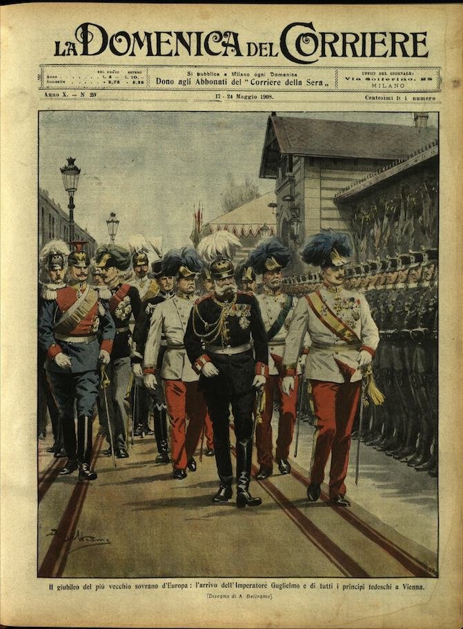In-4, brossura, in buono stato di conservazione. In questo numero:"Tragica fine di un piccolo equipaggio rimasto venti ore in balia delle onde dentro una scialuppa.""Il giubileo del più vecchio sovrano d'Europa, l'arrivo dell'Imperatore Guglielmo e di tutti i principi tedeschi a Vienna.".