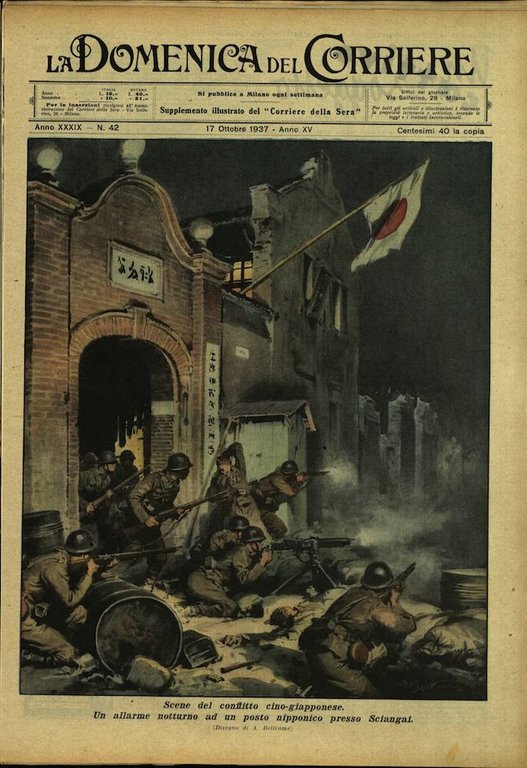 In-4, brossura, in buono stato di conservazione. In questo numero:"Scene del conflitto cino-giapponese. Un allarme notturno ad un posto nipponico presso Sciangai.""Sulla linea Adria-Piove di Sacco una littorina è stata investita da un bue sbucato improvvisamente da un lato della strada ferrata. Per l'urto il veicolo ha deviato, ma i viaggiatori, per fortuna, non hanno riportato né ferite né contusioni.".
