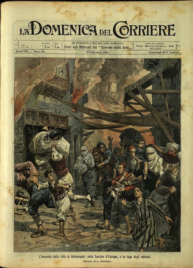 In-4, brossura, in buono stato di conservazione. In questo numero:"Una scena di terrore in un serraglio a Mosca in seguito alla fuga di leoni dalla gabbia.""L'incendio della città di Adrianopoli, nella Turchia d'Europa, e la fuga degli abitanti.".