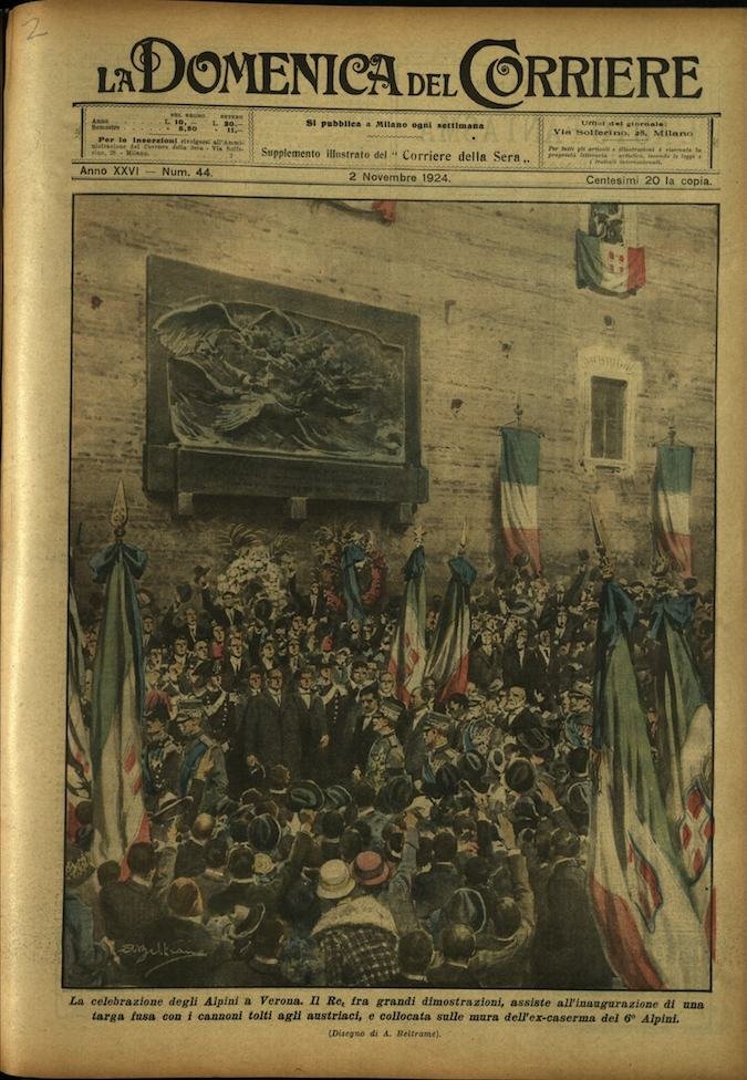 In-4, brossura, in buono stato di conservazione. In questo numero:"La celebrazione degli Alpini a Verona. Il Re, fra grandi dimostrazioni, assiste all'inaugurazione di una targa fusa con i cannoni tolti agli austriaci, e collocata sulle mura dell'ex-caserma del 6° Alpini.""L'ultima novita dell'aeronautica, il dirigibile porta-velivolo. Il primo esperimento è stato compiuto con successo a Dayton (Stati Uniti). Il velivolo è portato dal dirigibile per mezzo di un sistema di sospensione a trapezio, dal quale si puo staccare in qualsiasi momento con i propri mezzi.".