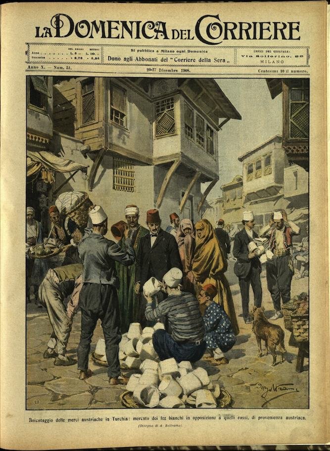 In-4, brossura, in buono stato di conservazione. In questo numero:"La mancanza di lavoro nelle Puglie, i forni presi d'assalto dai disoccupati a Cerignola.""Boicotaggio delle merci austriache in Turchia, mercato dei fez bianchi in opposizione a quelli rossi, di provenienza austriaca.".