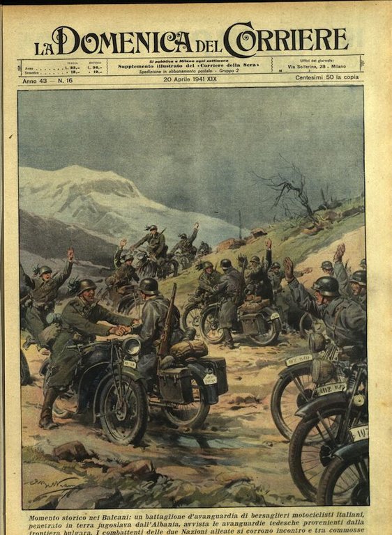 In-4, brossura, in buono stato di conservazione. In questo numero:"Momento storico nei Balcani, un battaglione d'avanguardia di bersaglieri motociclisti italiani, penetrato in terra jugoslava dall'Albania, avvista le avanguardie tedesche provenienti dalla frontiera bulgara. I combattenti delle due Nazioni alleate si corrono incontro e tra commosse grida di giubilo si abbracciano.""I fiori delle donne albanesi. Travolte le resistenze greche, le nostre truppe sono entrate trionfalmente in Corcia. La popolazione della cittadina albanese ha adornato le case di bandiere tricolori e dei purpurei vessilli d'Albania; le donne hanno cosparso di fiori le strade.".